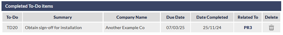 To-Do items that are related to a Project cannot be deleted. If deletion of a related To-Do item is attempted, a warning will be displayed.