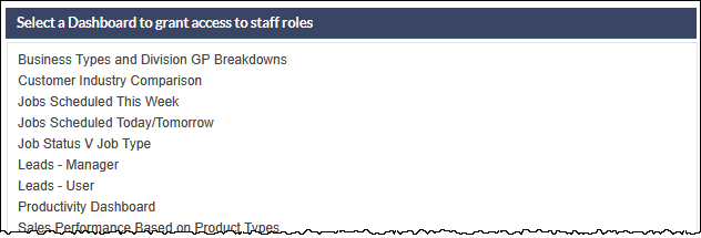 Tick the checkbox adjacent to the staff roles that should have access to the Dashboard.