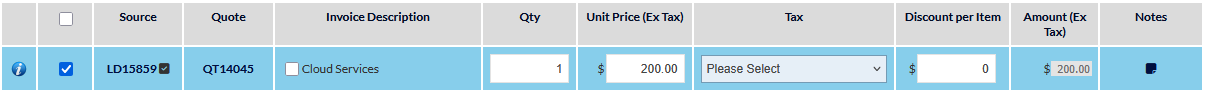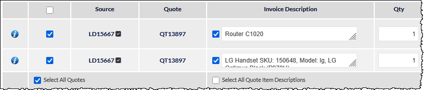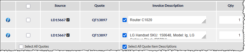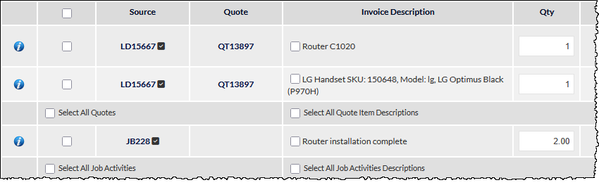 Each group includes a Select All [items in category] checkbox. For example, ticking the Select All Quotes checkbox (visible in the previous image), will automatically select all the Quote line items and the Invoice Descriptions for those line items: