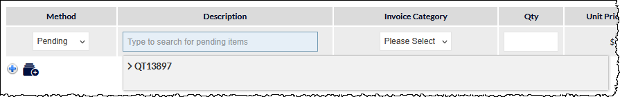 Click inside the Description field to activate the search feature. If there are any pending items, they will be categorised in the displayed dropdown list. The following image shows that there are pending items in quote QT12897: