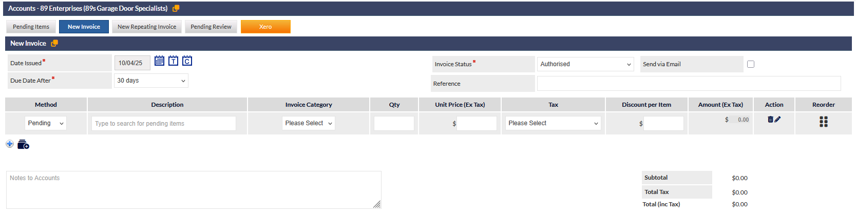 If the New Invoice tab is pressed, the New Invoice screen is displayed without any line items. Line items can be added manually as required.