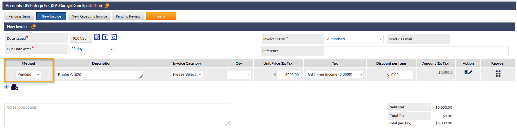 The following image shows the New Invoice screen with a single item. We can determine that this item was sourced by selecting the item in the Pending Items tab and pressing the New Invoice button, because the selection in the Method column for the line item is Pending (shown highlighted):