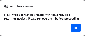 Recurring invoice items cannot be added to an invoice using the New Invoice button. If the New Invoice button is pressed, and a recurring invoice item has been ticked, a notification will be displayed: