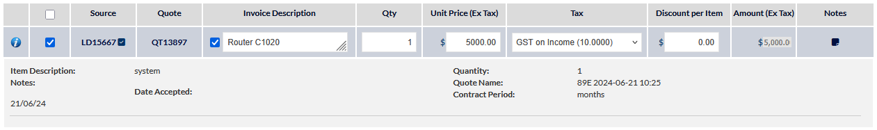 In the previous image, the Select All Quote Item Descriptions checkbox has been ticked. This expedites the selection of editing of the Invoice Description for all items in a category, without also selecting the line item.
