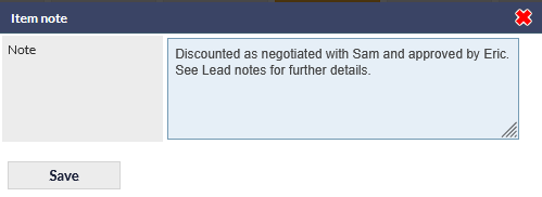 Press the note icon to add a note to this line item. The Item note pop-up is displayed: