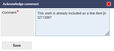 When the Acknowledge button is pressed, the Acknowledge comment pop-up is shown. This note is mandatory and is applied to all items that were selected prior to pressing the Acknowledge button: