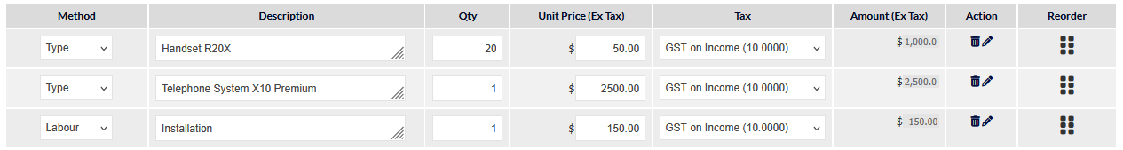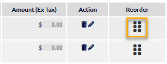 Each line item has a Reorder column which contains a handle (highlighted in the following image). Click and drag the handle (highlighted in the following image) for a line item to change the order of items in the invoice:
