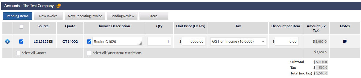 The following screenshot shows the Pending Items Tab selected. In this example, there is a single invoice line item that is a line item from a Quote.