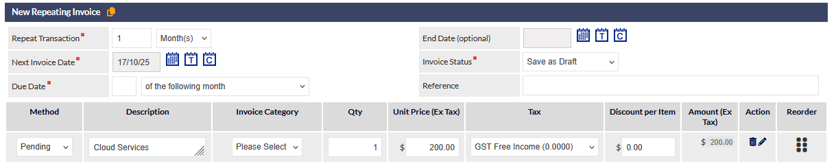 - Next Invoice Date - the date on which the repeat invoicing should start