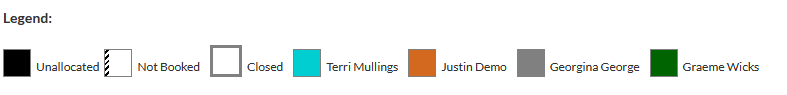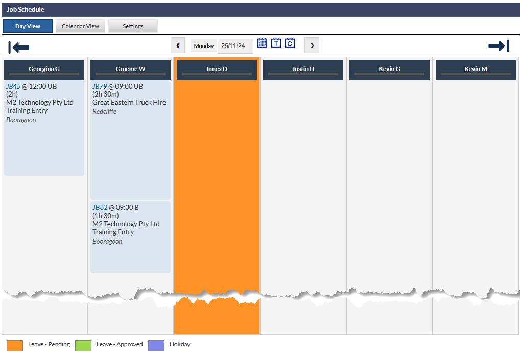 - The Legend (visible at the bottom of the previous image) displays information pertaining to colour-coding in the Day view. For example, in the previous image, the column for one of the Technicians has background colour orange, indicating Leave - pending approval.