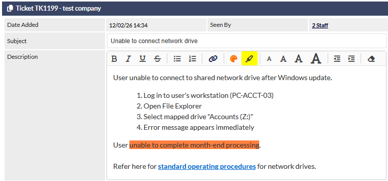 The Ticket Description field now supports text formatting, making it easier to structure and present information clearly within a ticket: