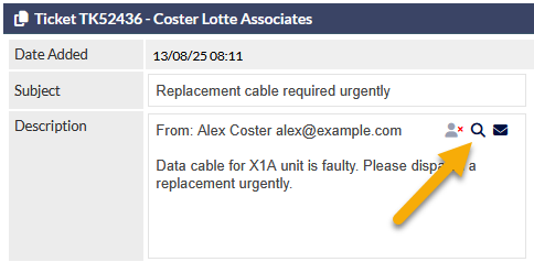 When a customer has emailed a ticket to CommTrak, the Description field now displays an email Preview (magnifier) icon, in addition to the Ignore Sender and Forward Original Email icons: