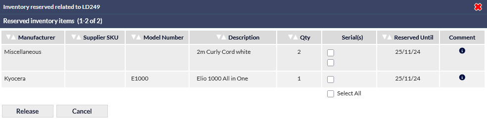 The following example image shows specific items being selected for release from reservation: