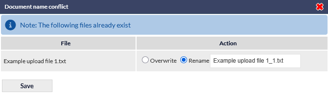 When uploading a file, if a file with the same name already exists in the destination folder, a Document name conflict window is displayed: