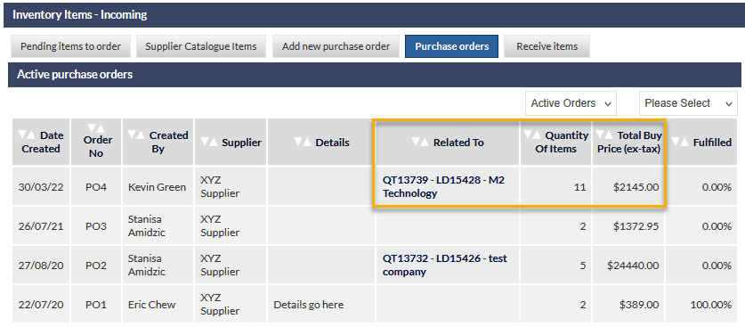 For more information about the Purchase Orders tab, please refer to the Purchase Orders section in the Inventory (Incoming) article.