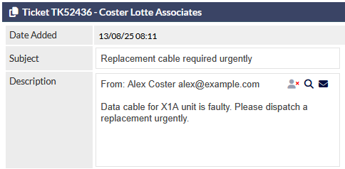 When a customer has emailed a ticket to CommTrak, the Description field will display up to three action icons:
