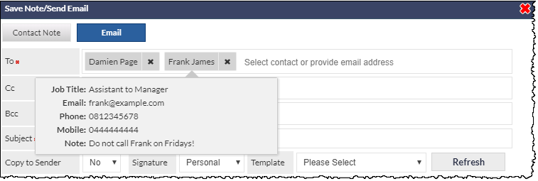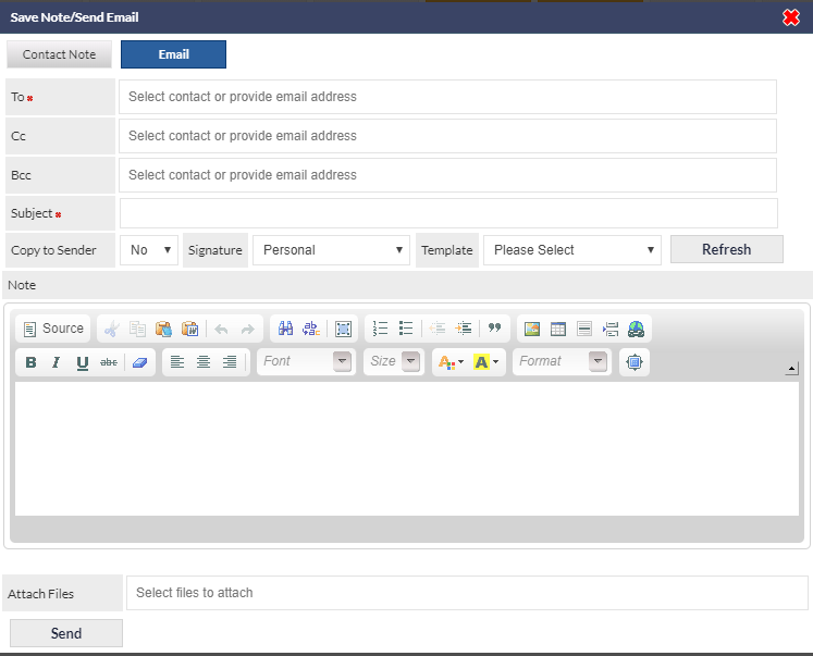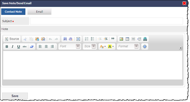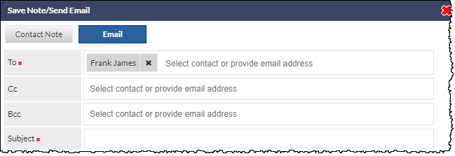 To send an email, click the New Note button to display the Save Note/Send Email pop-up window. This window has two tabs; Contact Note and Email. Click the Email tab.