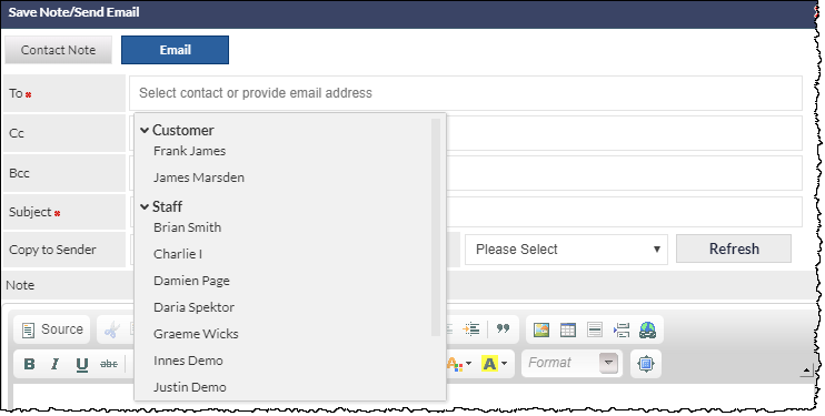 To select multiple email recipients, click in the blank area of the To field; the drop-down list of Customer contacts and Staff will be displayed again.