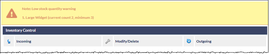 When viewing the Inventory screen, via the main navigation pane, low stock-quantity warnings (if any) are visible in a panel at the top of the screen.
