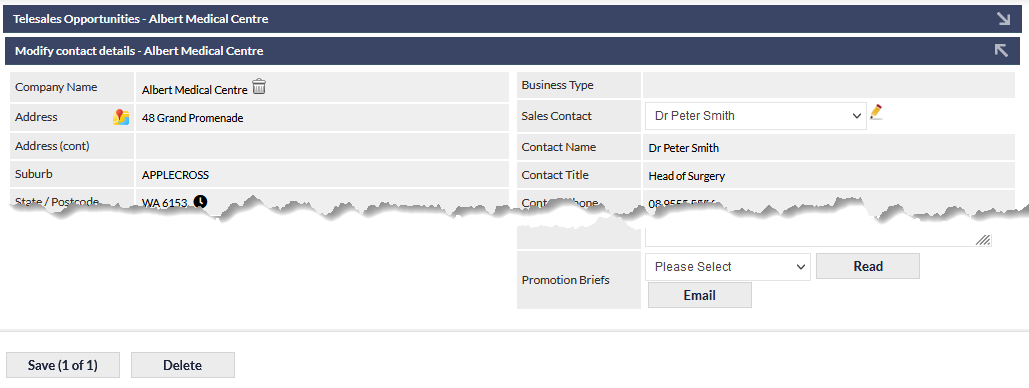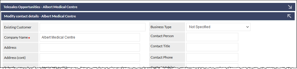 If the Contact Details section is read-only (as shown in the previous image), it can be updated by clicking the Main Info tab at the top of the screen (not shown in the previous image). Once updated, and saved, return to the opportunity by clicking the Telesales tab, and selecting the required opportunity.