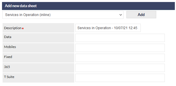 In the Add new data sheet section, select the required Data Sheet from the drop-down list, and complete the fields as required (noting any mandatory fields, as designated with a red asterisk).