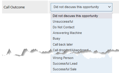Prior to submitting the call, ensure that all relevant fields have been completed accurately; in particular, the call outcome and call duration cannot be modified after the call has been submitted. Select the appropriate call outcome from the Call Outcome drop-down list: