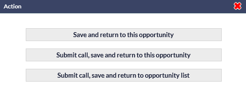 Save and return to this opportunity: save the current record and return to the current opportunity screen, without committing the call- Submit call, save and return to this opportunity: save the record, submit the call and stay on this opportunity screen